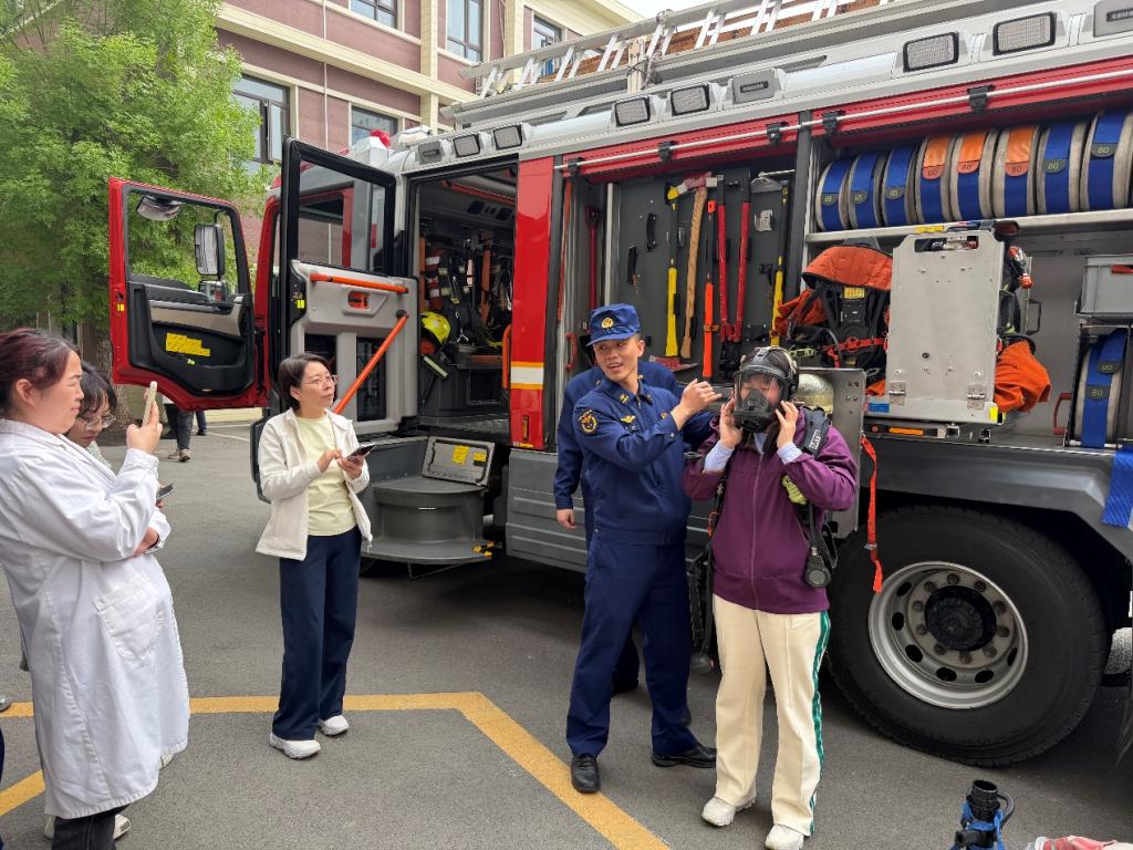 在消防车展示区,消防队员详细讲解车辆功能、随车救援装备用途与使用场景,带领大家近距离参观体验。参训人员还现场学习并试戴消防面具、消防氧气管等防护装备,掌握紧急情况下个人防护与呼吸保障技能。
